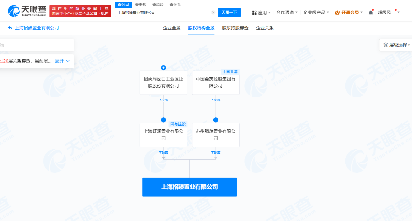 南方财经1月20日电,天眼查App显示,近日,上海招臻置业有限公司成立,法定代表人为祁彦龙,注册资本30亿人民币,经营范围包括房地产开发经营、住宅室内装饰装修、房地产经纪、住房租赁等。股权全景穿透图显示,该公司由招商蛇口(001979)旗下上海虹润置业有限公司、中国金茂控股集团有限公司旗下苏州腾茂置业有限公司共同持股。